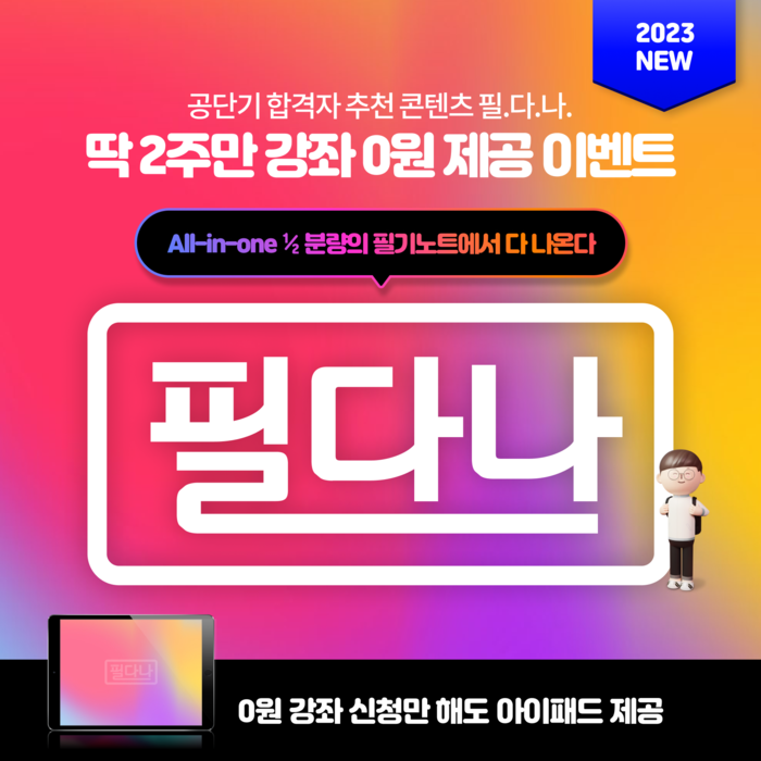 공단기는 필다나 교재 무료 배포를 기념해, 필다나 강좌를 신청하거나 수강 후기를 남긴 수험생을 대상으로 추첨을 통해 아이패드 9세대, 아메리카노 기프티콘, 편의점 모바일 상품권 등을 증정하는 이벤트를 오는 9월25일까지 진행한다.