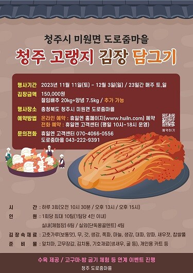시 관계자는 “재료준비와 뒷정리 걱정 없이 편하게 김치를 담그실 수 있도록 이번 행사를 마련했으니, 시민 분들의 많은 참여를 바란다”면서, “청주시의 농촌지역이 더욱 살기 좋고 활력 넘치는 공간으로 발전해 나갈 수 있도록 필요한 지원을 아끼지 않을 것”이라고 말했다.