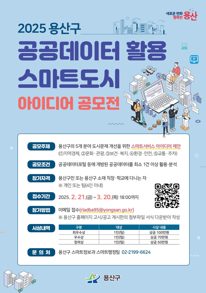 [시민일보 = 문민호 기자] 용산구(구청장 박희영)가 오는 3월20일까지 ‘2025년 용산구 공공데이터 활용 스마트도시 아이디어 공모전’을 개최한다.