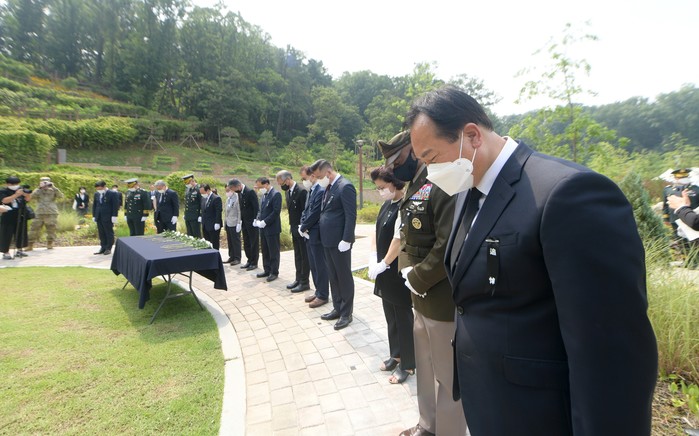 경기 오산시는 5일 죽미령 평화공원에서 ‘제72주년 유엔군 초전기념 및 미 스미스부대 전몰용사 추도식’을 진행했다. 6.25전쟁 발발 직후 북한군이 서울에서 남하하는 통로인 죽미령에서 일어난 전투로, 스미스 특수임무 부대원들이 맞서 싸워 북한국의 남진을 지연시켜 반전의 계기가 됐다. 사진은 행사에서 이권재 시장(오른쪽)이 묵념을 하고 있는 모습. (사진제공=오산시청)