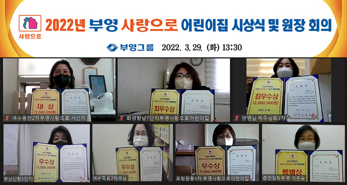 부영그룹은 29일 온라인 비대면 방식으로 ‘2022년 어린이집 원장회의 및 시상식’을 열고 지난해 모범적으로 ‘안심 어린이집’을 실천한 ‘여수웅천2차 부영 사랑으로 어린이집(원장 서선자)’을 대상으로 선정했다.
