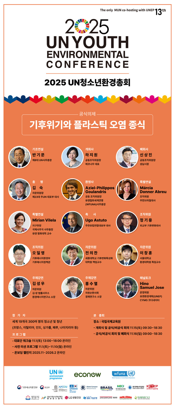 이번 ‘UN청소년환경총회’는 유엔환경계획(UNEP), (사)에코나우, 유엔협회세계연맹(WFUNA)이 주최하며, 우리나라를 포함해 프랑스, 이탈리아, 인도, 싱가포르, 페루, 케냐, 나이지리아 등 세계 19개국 300여 명의 청소년과 청년이 참여한다.