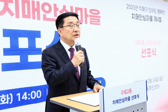 | ▲ 구로2동 치매안심마을 선포식에서 축사를 하는 문헌일 구청장. (사진=구로구청 제공) |