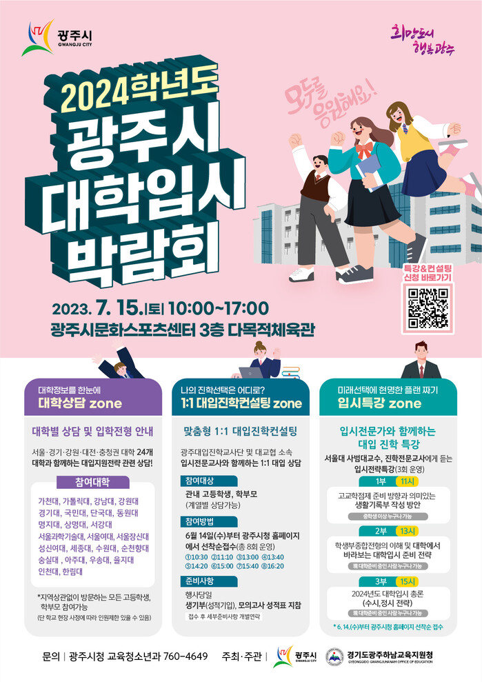 오는 7월15일 광주시문화스포츠센터 다목적체육관에서 진행되는 행사장에는 서강대를 비롯한 서울 및 수도권 총 24개 대학이 참여하는 상담부스를 운영해 수험생과 학부모들에게 다양한 대학별 전형 정보를 제공할 예정이다.