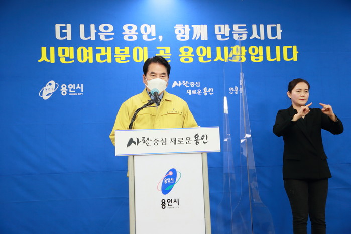 | ▲ 백군기 용인시장이 용인시에 코로나19 역대 최다 확진자가 발생한 26일 긴급 브리핑을 열고 시민들에게 잠시 멈춤에 동참해 줄 것을 당부하고 있다. |