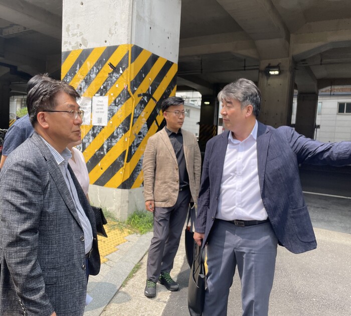 | ▲ 성수역 출입구 신설 등을 위해 현장 실사를 하고 있는 모습. (사진=성동구청 제공) |
