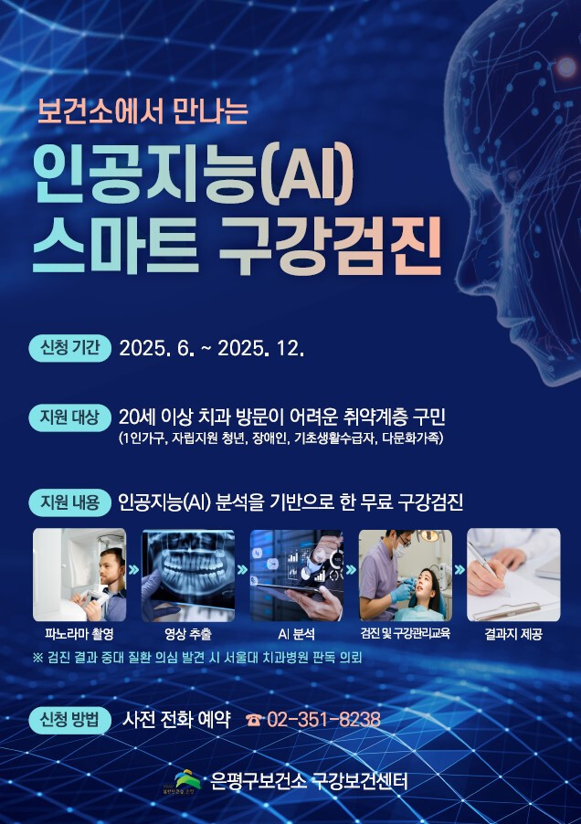 [시민일보 = 이대우 기자] 서울 은평구(구청장 김미경)가 22일부터 보건소에서 인공지능(AI) 분석을 기반으로 한 ‘스마트 구강검진 관리 시스템’의 사전 접수를 받는다.