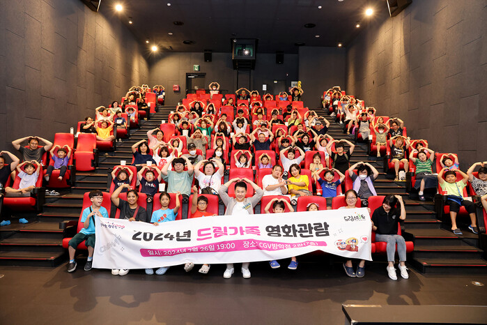 서울 도봉구는 최근 여름방학을 맞이해 드림스타트 가족을 대상으로 영화관람 행사를 개최해 가족영화 <슈퍼배드 4>를 관람했다. 도봉구 드림스타트는 12세 이하 취약계층 아동에게 맞춤형 통합서비스를 제공해 아동의 건강한 성장과 발달을 도모하고 있다. 사진은 드림스타트 가족과 오언석 구청장(앞줄 가운데)이 ‘머리 하트’를 그리고 있는 모습. (사진=도봉구청 제공)