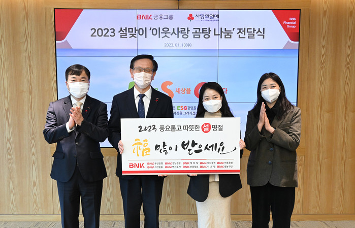 BNK금융그룹에 따르면 이날 행사에서 전달된 ‘한우 곰탕 세트’는 부산사회복지공동모금회를 통해 지역 복지시설 50여곳의 아동과 노인, 장애인 등 이웃들의 따뜻한 명절나기에 사용된다.