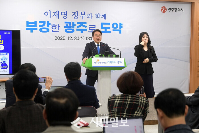 | ▲ 강기정 광주광역시장이 3일 오후 시청 비즈니스룸에서 2026년 국비예산 관련 기자회견을 하고 있다. /광주광역시 제공 |