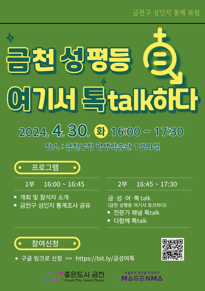 [시민일보 = 여영준 기자] 금천구(구청장 유성훈)는 30일 오후 4시 구청 평생학습관에서 성인지 통계 포럼 ‘금천 성평등 여기서 토크(Talk), 금·성·여·톡(Talk)’을 개최한다고 밝혔다.