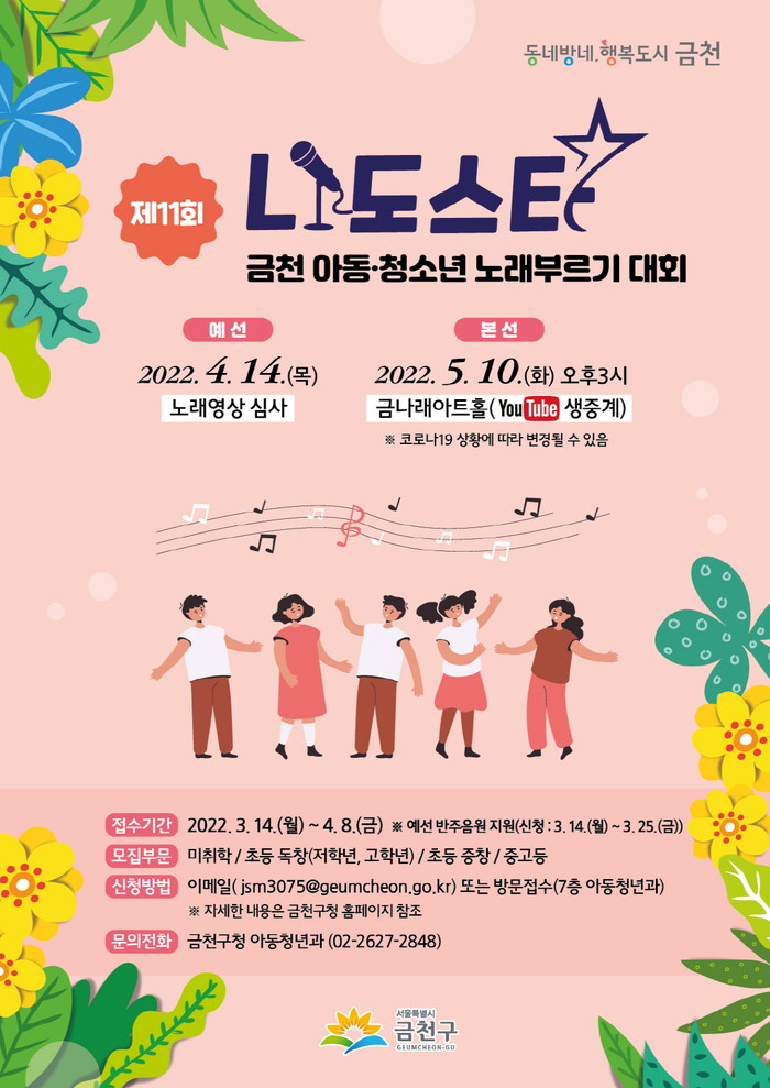 [시민일보 = 여영준 기자] 서울 금천구(구청장 유성훈)는 14일~오는 4월8일 ‘제11회 나도스타 금천 아동·청소년 노래부르기 대회’ 참가자를 모집한다고 밝혔다.