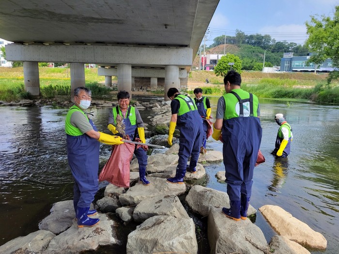 경기 오산시는 지난 21일 오산천 주변의 산책로를 돌며 쓰레기를 수거하는 활동과는 달리 직접 수중으로 들어가 수질을 오염시키는 각종 쓰레기를 수거하고 수질정화 식물을 식재하는 등 오산천 수질정화 활동을 펼쳤다. 사진은 이날 참여한 봉사자들이 오산천에서 쓰레기를 수거하고 있는 모습. (사진제공=오산시청)