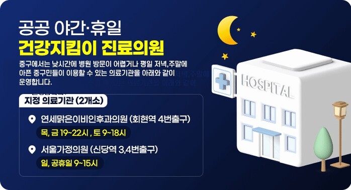 [시민일보 = 여영준 기자] 서울 중구(구청장 김길성)는 공공 야간·휴일 건강지킴이 진료의원을 지정 운영한다고 4일 밝혔다.