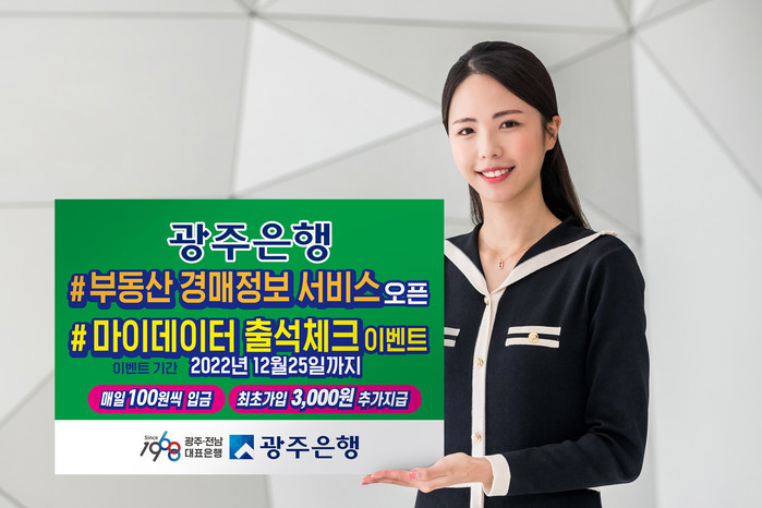 [시민일보 = 이대우 기자] 광주은행(은행장 송종욱)은 ‘부동산 경매 정보 서비스’를 새롭게 선보이고, 더불어 ‘마이데이터 출석체크 이벤트’를 실시한다고 밝혔다.