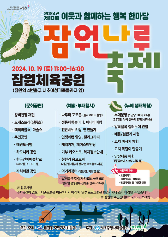 [시민일보 = 박소진 기자] 서울 서초구(구청장 전성수)가 오는 19일 잠원체육공원에서 누에를 테마로 한 ‘잠원나루축제’를 개최한다.