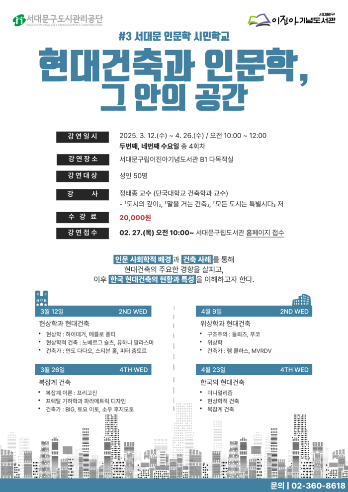 서대문구립이진아기념도서관에서 운영하는 『서대문 인문학 시민학교』는 서대문구 지역주민의 인문학 소양 제고를 위한 중장기 프로그램이며 올해 상반기 주제로는 ‘건축 인문학’이 선정되었다.
