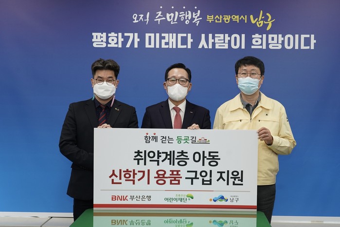 [시민일보 = 여영준 기자] BNK부산은행이 3일 오전, 부산 남구청에서 부산 남구청, 초록우산어린이재단과 신학기 지원사업 ‘함께 걷는 등굣길’ 전달식을 갖고 지역 저소득가정 학생에게 신학기 용품을 후원하기로 했다.