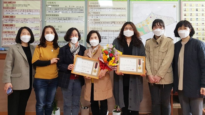 경기 수원시 장안구 정자2동은 최근 지역사회발전에 기여한 이희숙·양현희 새마을문고 회원에게 장안구청장 표창을 수여했다. 표창 수여자들은 어린이 및 주민들이 책을 가까이 할 수 있도록 매년 어린이용 전문서적과 교양도서 등 도서 구비에 힘쓰는 등 새마을문고 활성화에 앞장서 왔다. 사진은 수여식에서 관계자들이 기념촬영을 하는 모습. (사진제공=장안구청)
