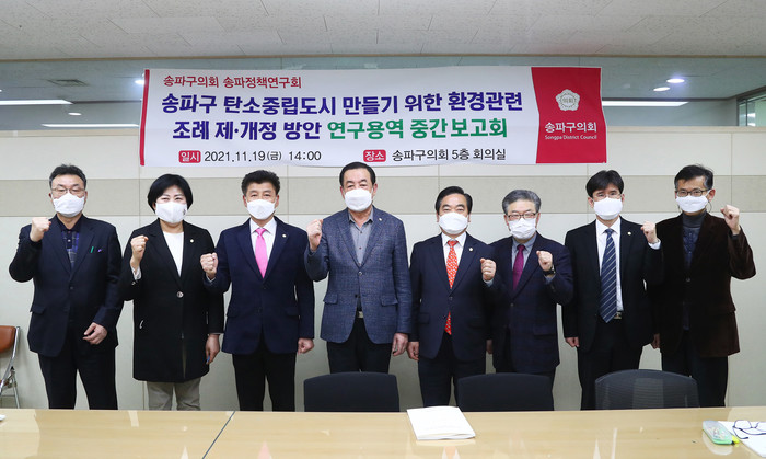 [시민일보 = 이대우 기자] 서울 송파구의회 의원연구단체 ‘송파정책연구회’(회장 한상욱)는 최근 ‘송파구 탄소중립도시 만들기 위한 환경 관련 조례 제·개정방안’ 연구용역 중간보고회를 개최했다.