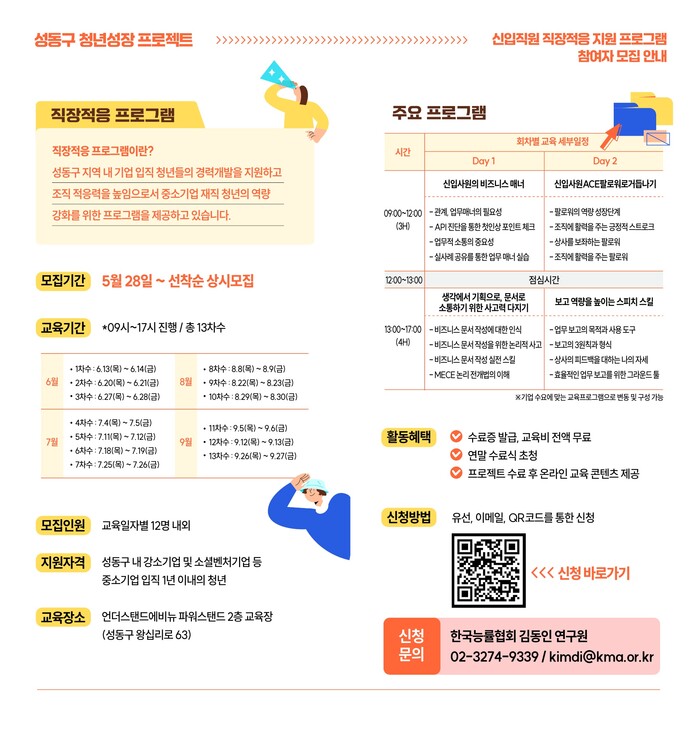 해당 교육은 6월 13일부터 4개월간 서울숲 언더스탠드에비뉴 2층 교육장에서 회차당 12명씩 10회에 걸쳐 진행되며, 교육컨설팅 전문기관 (사)한국능률협회가 위탁 운영한다. 참여를 희망하는 기업이나 참여자는 성동구청 누리집을 통해 신청하거나 (사)한국능률협회에 전화 접수하면 된다.