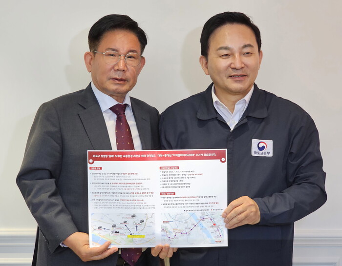| ▲ 지난 5월 원희룡 국토교통부장관에게 요청사항을 전달하는 박강수 구청장(왼쪽). (사진=마포구청 제공) |