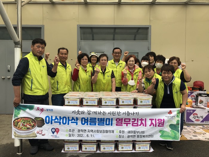 경기 양주시 광적면 지역사회보장협의체는 지정기탁금을 이용해 15일 '아삭아삭 여름별미 열무김치 지원' 사업을 실시했다. 이날 지역내 저소득 홀몸노인 등 취약계층 100가구에 조미김과 함께 직접 만든 열무김치를 각 가정에 전달했다. 사진은 이날 참가한 협의체 위원들이 기념촬영을 하고 있는 모습. (사진제공=양주시청)