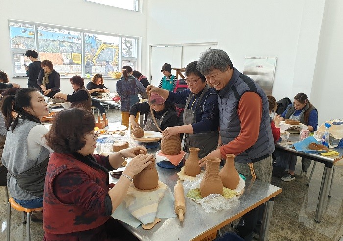 | ▲ 영암군 지역민들이 영암군도기박물관에서 실시하는 생활도예교육에 참여해 도예성형을 하고 있다. / 사진=영암군 제공 |