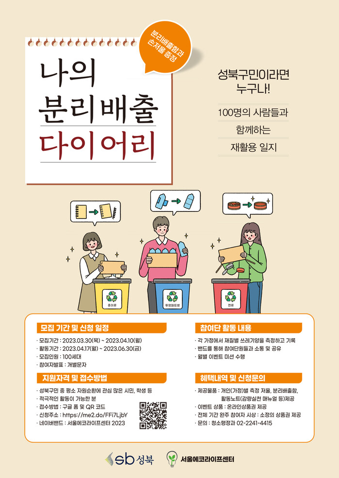 [시민일보 = 홍덕표 기자] 서울 성북구(구청장 이승로)가 오는 4월10일까지 '성북구 확줄자(쓰레기를 확 줄인 자)' 시민실천 프로그램에 참여할 참여단 100가구를 모집한다.