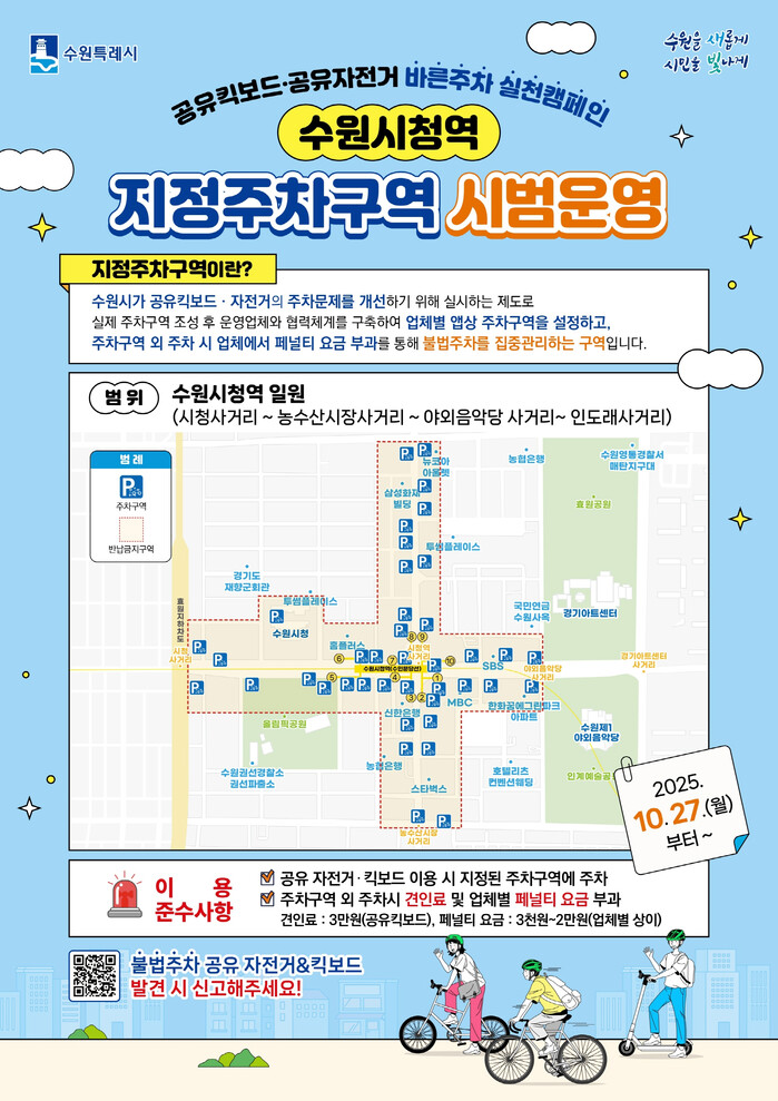 시범운영 구역은 수원시청역 주변 44곳이다. 지정된 구역에만 공유 자전거와 킥보드를 세울 수 있다. 구역외에 주차하면 업체별로 3000원에서 2만원까지의 페널티가 부과된다.