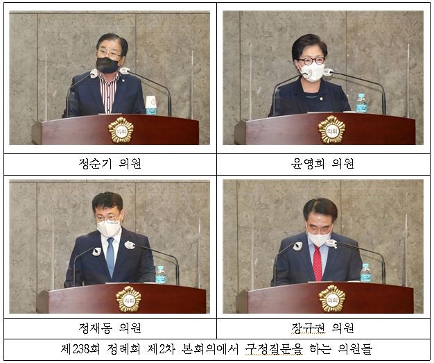 [시민일보 = 여영준 기자] 서울 금천구의회(의장 김용술) 정순기·윤영희·정재동·장규권 의원이 지난 22일 제238회 제1차 정례회 제2차 본회의에서 일괄질문 일괄답변 방식으로 구정 전반에 대한 질문을 했다.