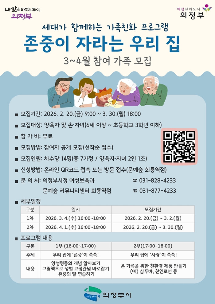 [시민일보 = 민장홍 기자] 경기 의정부시는 문예숲 커뮤니티센터 회룡역점(회룡역사 3층)에서 운영하는 ‘존중이 자라는 우리 집’ 프로그램 참여 가정을 19일부터 선착순으로 모집한다.