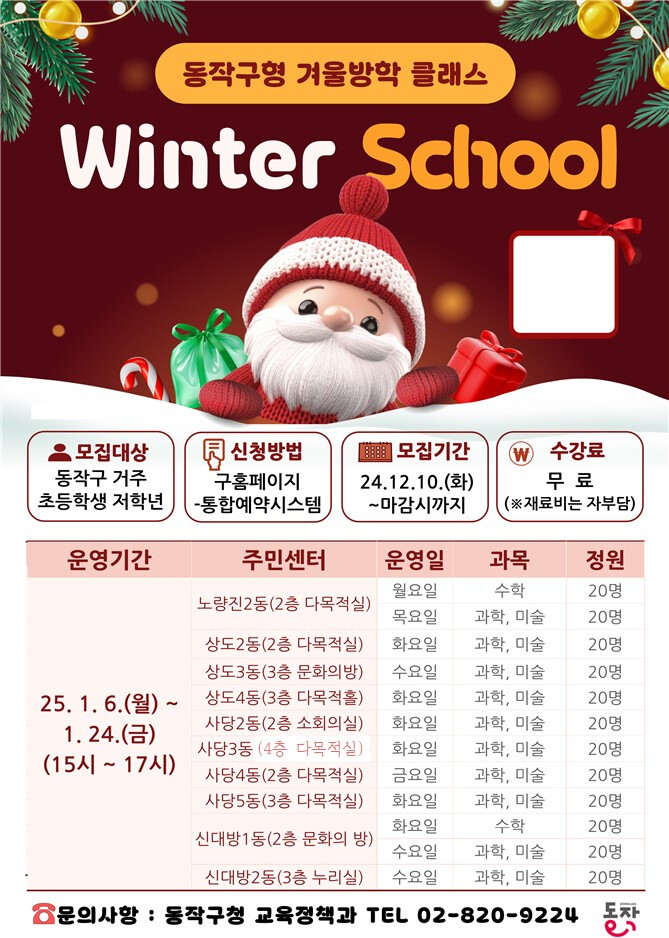 [시민일보 = 여영준 기자] 동작구(구청장 박일하)는 돌봄 공백을 해소하고, 아이들이 건강하고 즐겁게 겨울방학을 보낼 수 있도록 동작형 돌봄교실인 ‘Winter School’을 운영한다고 밝혔다.