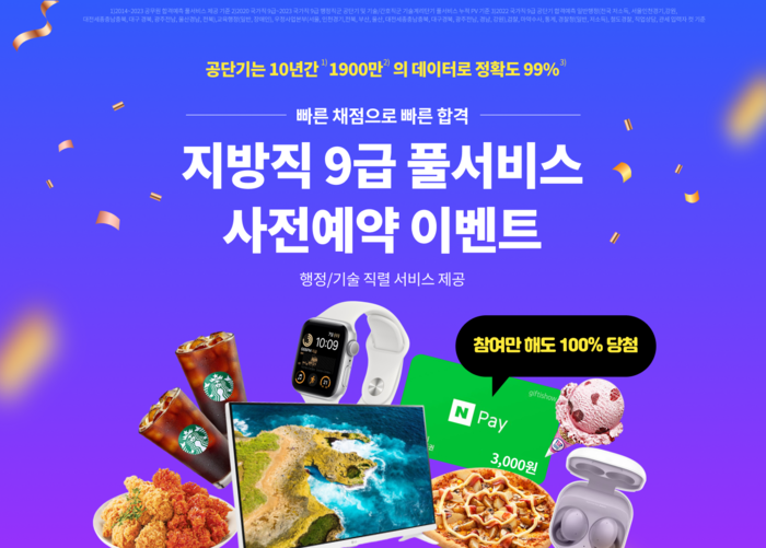 공단기와 기술계리단기의 지방직 9급 풀서비스 오픈에 앞서 다양한 사전 이벤트를 진행한다. ▲응시 번호 입력 이벤트 ▲100% 당첨 사전 예약 이벤트 ▲소문내기 이벤트를 6월9일까지 진행하며 각종 외식 상품권과 LG 스마트 TV 모니터, 애플워치 SE 40mm, 삼성 갤럭시 버즈2, 롯데시네마 1인 2D 영화관람권 등 다양한 이벤트 경품이 준비돼 있다.