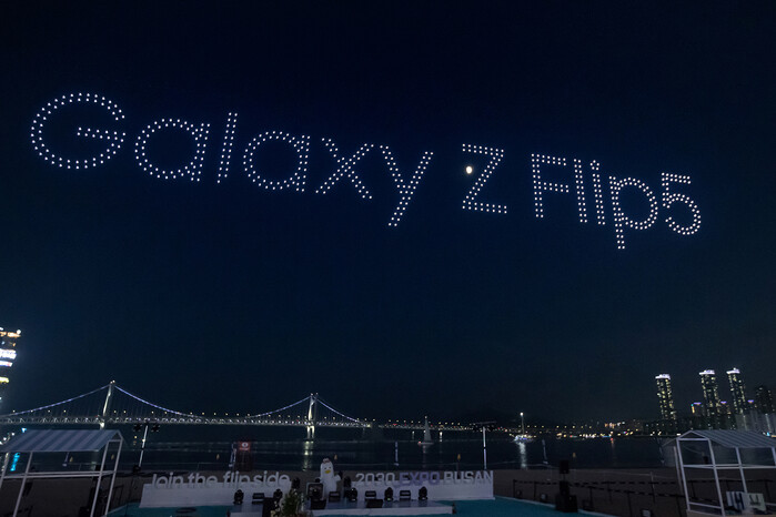드론은 '갤럭시 Z 플립5'·'갤럭시 Z 폴드5' 제품명과 함께 접히는 폴더블 스마트폰의 형상을 선보이며 부산 광안리 밤하늘을 밝혔다.