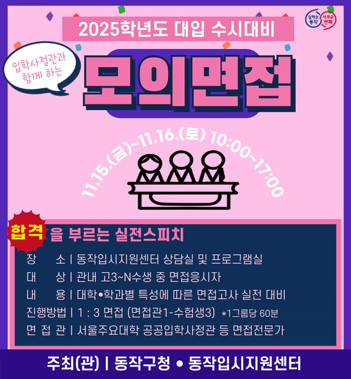 동작입시지원센터 주관으로 열리는 이번 프로그램은 2025학년도 대입 수시전형에 응시하는 학생들에게 실전과 같은 면접 경험을 제공해 학생들의 심리적 부담감을 줄이고 대입 준비에 도움을 주고자 기획됐다.
