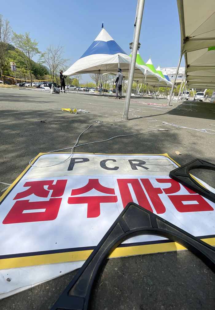 대구스타디움에 설치됐던 임시선별검사소가 12일 오전 철거되고 있다.