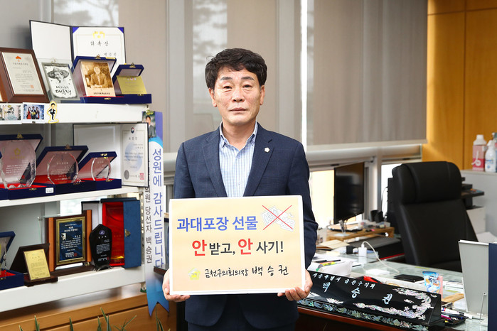 [시민일보 = 여영준 기자] 백승권 서울 금천구의회 의장이 12일 의장 집무실에서 생활 속 실천을 통한 ‘과대포장 안 받고, 안 사기’ 챌린지에 동참했다.