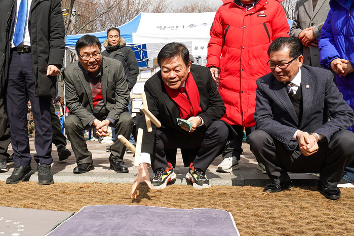 | ▲ 16일 장안제1동 정월대보름 민속놀이 행사에 참석한 이필형 동대문구청장이 윷을 던지고 있다 (사진=동대문구청 제공) |