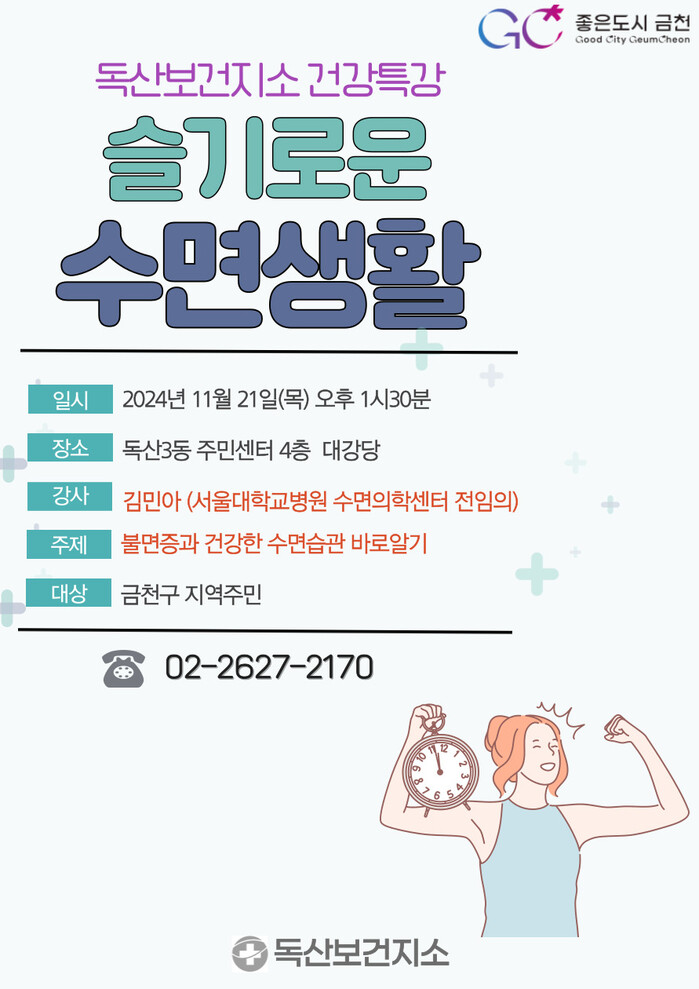 [시민일보 = 여영준 기자] 서울 금천구(구청장 유성훈)는 오는 21일 독산3동 주민센터 4층 대강당에서 구민들의 건강한 수면을 위한 ‘슬기로운 수면 생활’을 주제로 건강특강을 진행한다고 밝혔다.