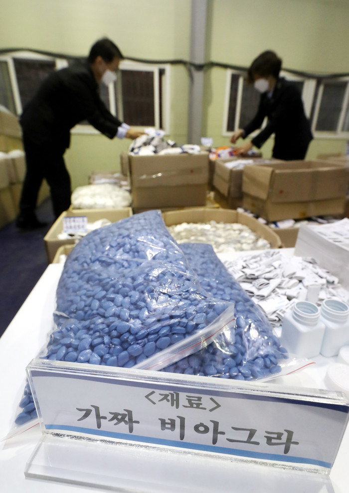 인천본부세관은 중국에서 밀수입된 가짜 비아그라 등 발기부전치료제를 정품으로 속여 국내 유통한 조직원 8명을 검거하고 이들 중 2명을 구속했다고 30일 밝혔다. 사진은 이날 세관 관계자들이 압수한 치료제와 포장 용기 등을 공개하는 모습.