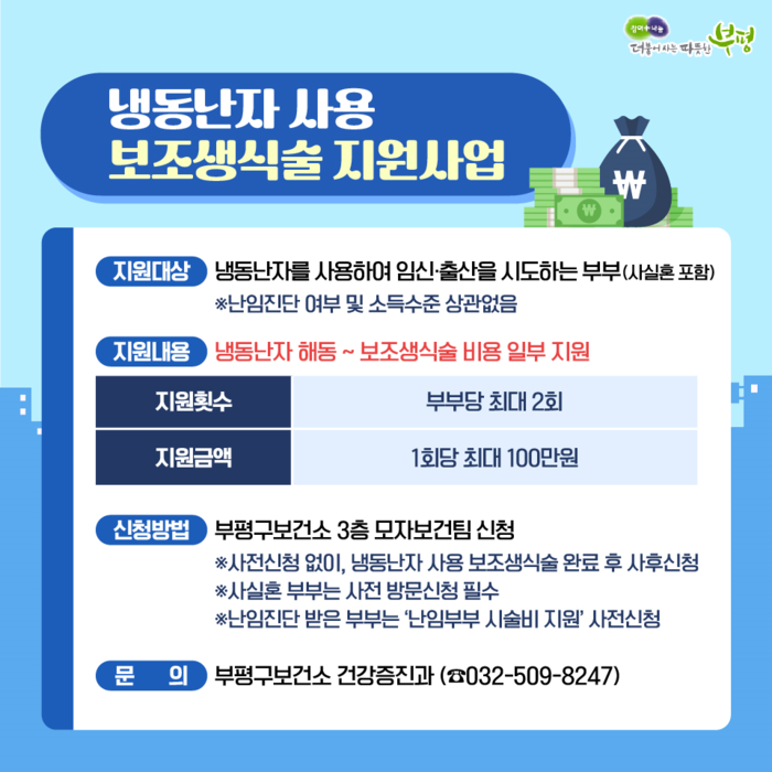 [인천=문찬식 기자] 인천 부평구(구청장 차준택)는 아이를 원하는 부부의 임신·출산을 적극적으로 지원하기 위해 ‘냉동 난자 사용 보조생식술 지원사업’을 진행한다고 12일 밝혔다.