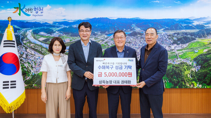 김윤철 합천군수는 “지역 기업인이 따뜻한 마음을 보태주셔서 피해 주민들에게 큰 힘이 될 것”이라며 “기탁해 주신 성금은 꼭 필요한 곳에 사용해 조속한 피해 복구에 최선을 다하겠다”고 밝혔다.