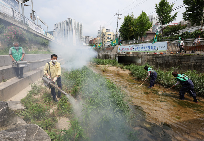 5일 성북구청 앞 성북천 산책로에서 이승로 성북구청장과 방역 봉사대원들이 최근 도심을 덮친 러브버그 대량 발생에 대비해 방역을 하고 있다.