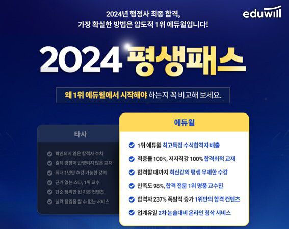 종합교육기업 에듀윌이 2024년 행정사 시험을 대비하는 수험생을 위해 ‘행정사 평생패스’ 과정을 운영한다.