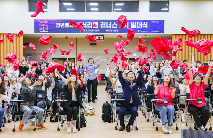 서울 서초구가 최근 구청 2층 대강당에서 ‘2025 서리풀뮤직페스티벌’의 든든한 러닝메이트가 돼줄 청년봉사단 ‘서리풀 러너스’ 2기 발대식을 개최했다. 사진은 발대식에서 전성수 구청장(오른쪽 세 번째)이 청년들과 함께 분홍색 서리풀뮤직페스티벌 티셔츠를 던지는 모습. (사진=서초구청 제공)