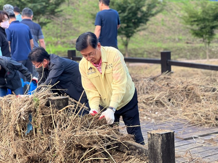 경기 양평군 간부 공무원들이 21일 지역내 집중호우로 피해를 입은 수해 현장에서 봉사활동을 실시하며 피해 복구 작업에 힘을 보탰다. 사진은 이날 참여한 전진선 군수(오른쪽)가 양강섬과 물맑은양평시장을 잇는 세곡선길 일원에서 쓰레기 수거 등 하천 정화 활동을 하고 있는 모습. (사진제공=양평군청)