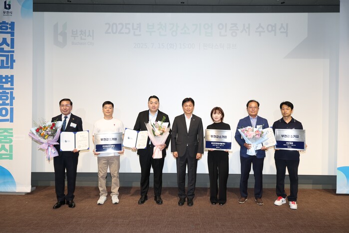 경기 부천시가 최근 판타스틱 큐브에서 ‘2025년 부천강소기업’으로 선정된 10개 기업에 인증서와 현판을 수여했다. 이번 행사는 강소기업의 위상을 높이고 지역 경제의 성장 주체인 기업을 격려하기 위해 열렸으며, 선정기업 대표와 부천강소기업협의회 임원 등 40여명이 참석했다. 사진은 수여식에서 조용익 시장(가운데)이 강소기업 관계자들과 기념 촬영을 하는 모습. (사진=부천시청 제공)