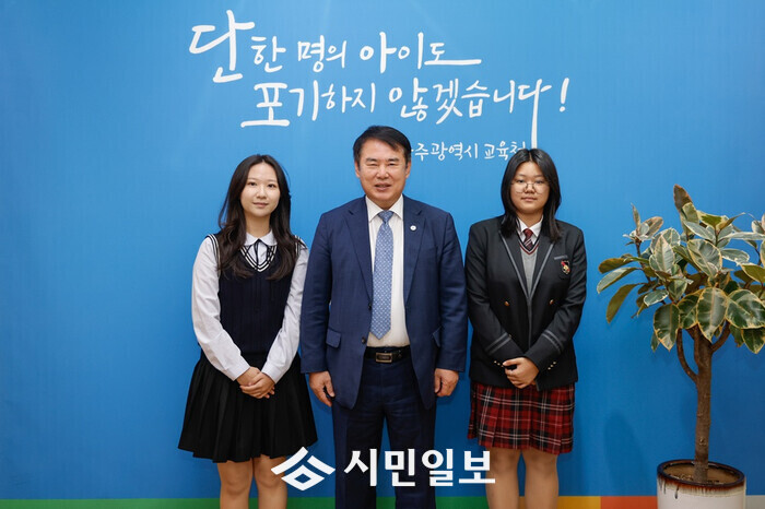 | ▲ 이정선 광주시교육감(사진 가운데), 27일 본청 교육감실에서 새로 선출된 15기 고등의회 김나영 의장(살레시오여고 2학년, 왼쪽 첫 번째), 김민아 부의장(빛고을고 2학년, 왼쪽 세 번째)과 기념촬영. / 광주시교육청 제공 |