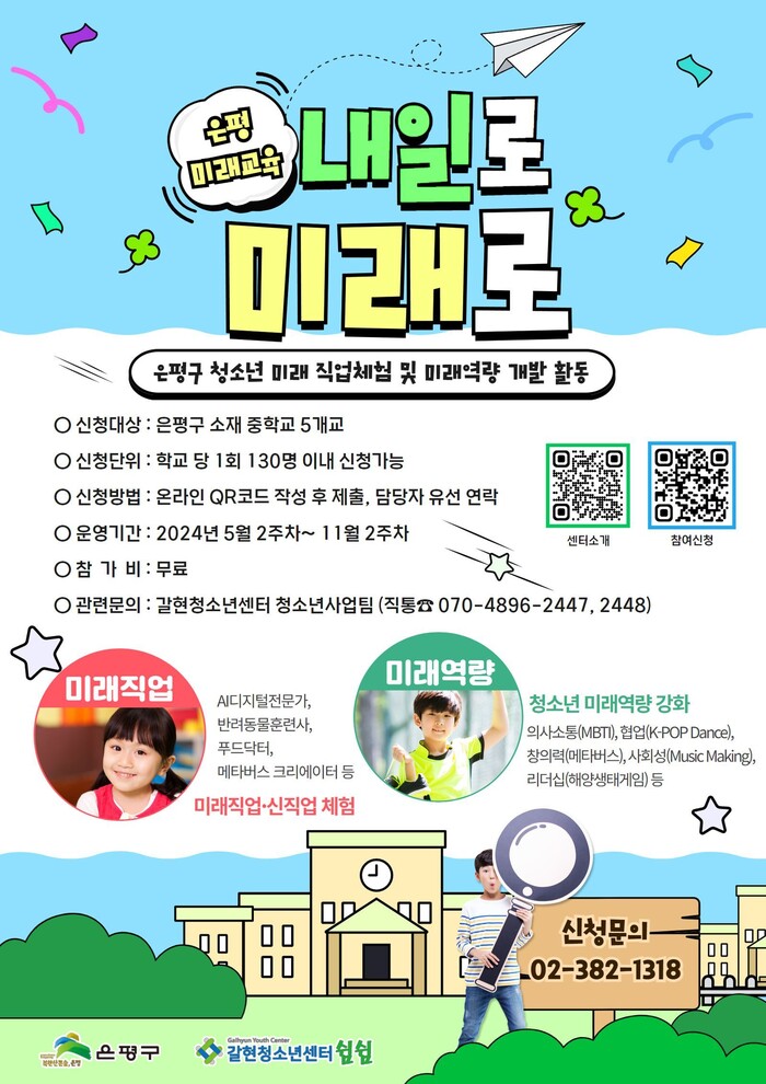 ‘내일로 미래로’ 프로그램은 학사일정에 따라 오는 7월부터 5개 중학교 대상으로 추진된다. 신청을 원하는 학교는 포스터를 참고해 QR코드로 제출하거나 담당자로 전화하면 된다. 향후 프로그램 진행 결과는 은평구 갈현청소년센터 페이스북, 네이버 블로그, 인스타그램 등을 통해서 확인할 수 있다.